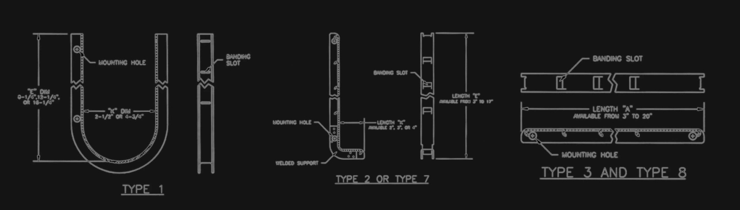 Offered in standard sizes ranging from ¾” through 6” wide. Available in zinc plated mild steel and type 316 stainless steel.